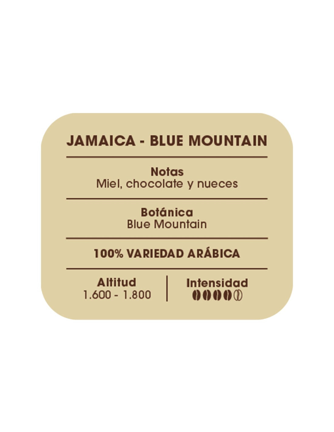 Blue Mountain. Jamaica: Intensidad alta. Café de las Antillas. El más prestigioso y cotizado café del mundo, de delicioso sabor afrutado. Con ligeras trazas a chocolate y nueces. Su extraordinario perfume y moderada acidez hacen que este café sea considerado el más equilibrado del mundo. Café 100% variedad arábica.